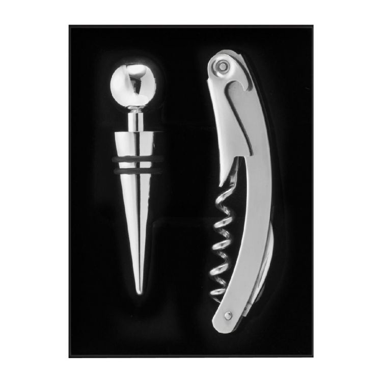 Set à vin en métal composé d'un tire-bouchon et d'un bouchon.