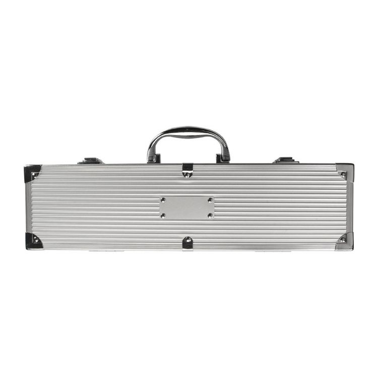 Set barbecue dans une malette en aluminium comprenant une spatule, une pince et une fourchette à viande.