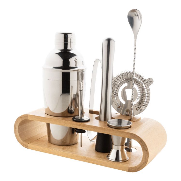 Coffret cocktail 7 pièces en acier inoxydable avec son support en bambou. Comprend : shaker à cocktail (550 ml), doseur, passoire, cuillère à cocktail, pilon, pince à glaçons et un bec verseur
