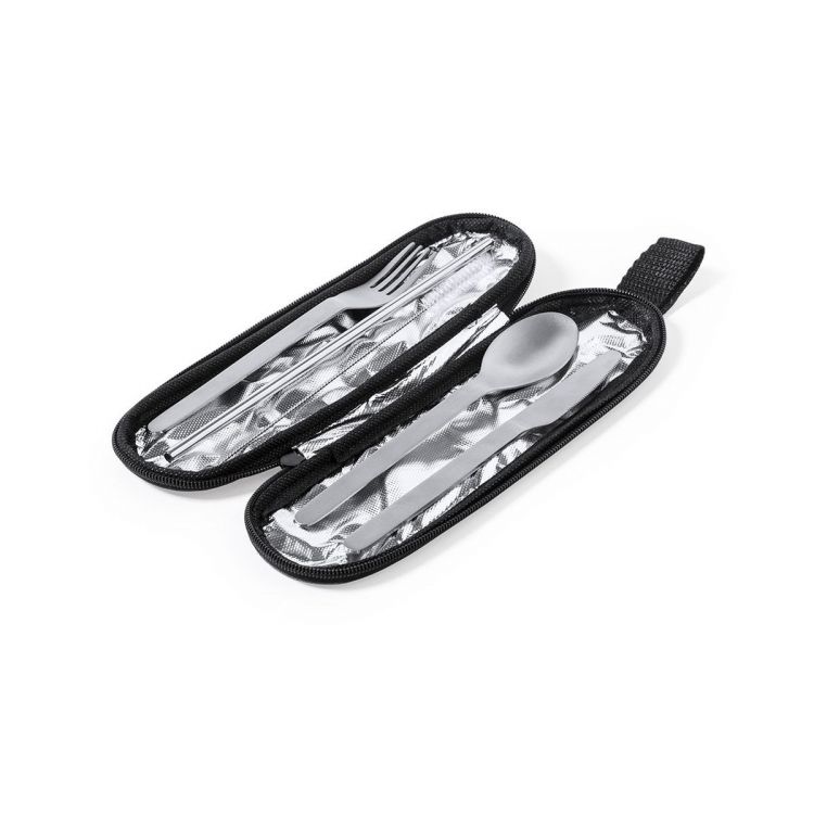 Ensemble de couverts réutilisables en acier inoxydable résistant et durable. Comprend une cuillère, un couteau, une fourchette, une paille et un accessoire de nettoyage. Présenté dans un élégant étui individuel en polyester 300D RPET, fabriqué à partir de plastique recyclé pour encourager la réutilisation des déchets plastiques et contribuer à la durabilité de la planète. Étui avec bandoulière, fermeture zippée et étiquette RPET sur létiquette. (couleur naturel)
