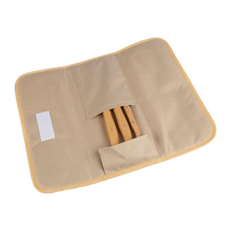 Set de 3 couteaux de service en bois et acier inoxydable dans une pochette en rPET 600D fermée par velcro dans une boîte cadeau en kraft.