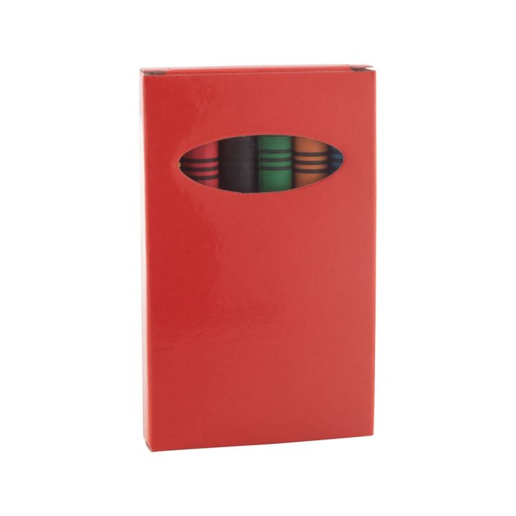 Set de 6 crayons de couleurs recouvert de papier présenté dans une boîte fenêtre en papier cartonné de couleur.