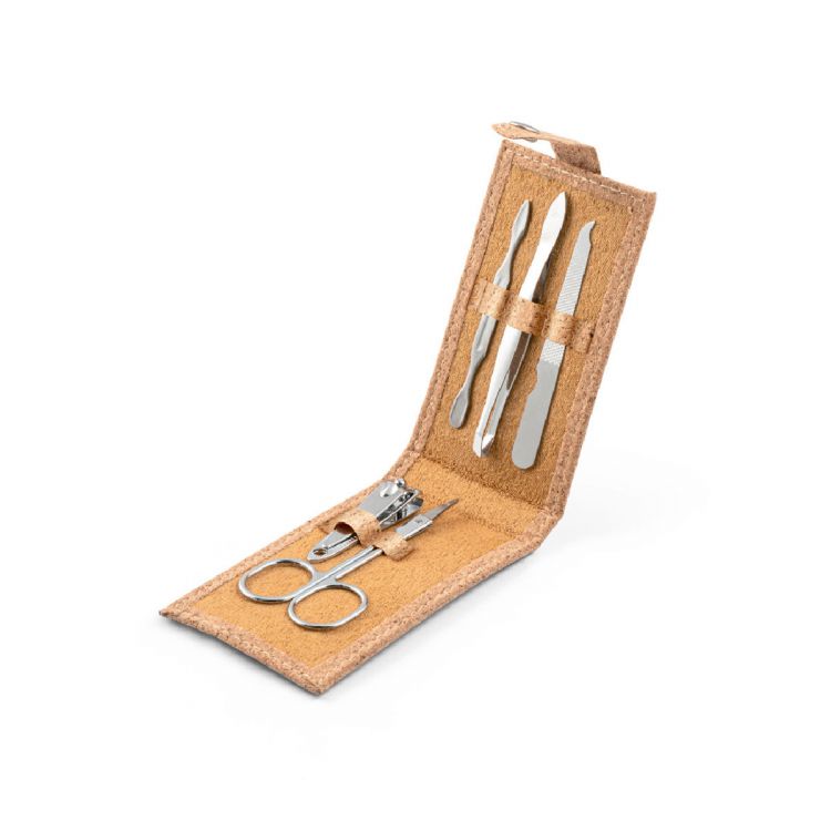 Kit de manicure en liège avec 5 pièces en acier inoxydable: lime, ciseaux, coupe-ongle, pince et pousse-cuticules. Livré sous pochette papier. Le produit étant fabriqué à partir de matériaux naturels, la couleur du produit ainsi que le résultat de l'impression peuvent varier d'un produit à l'autre. Produit en couleur naturel