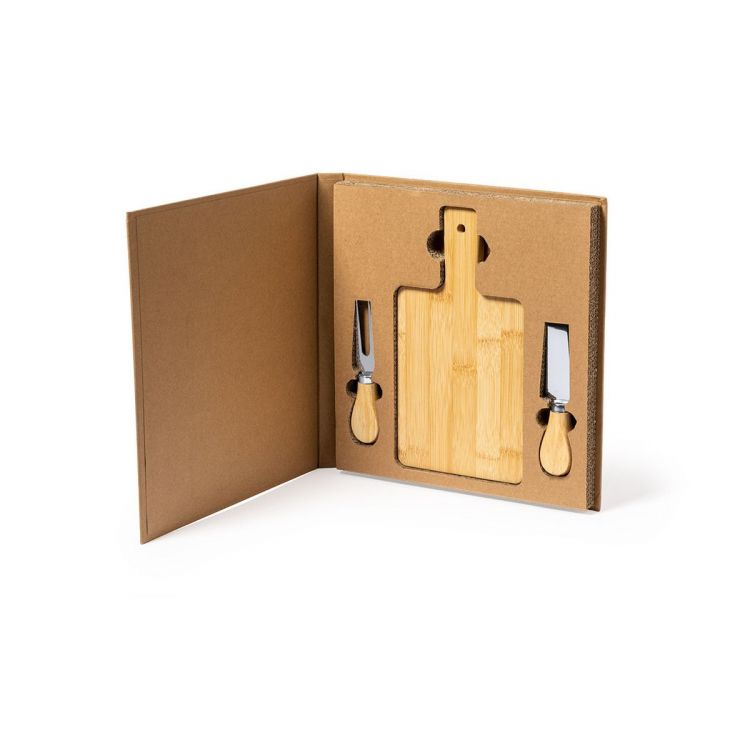 Ensemble complet de fromages ligne nature, en bambou et acier inoxydable. Comprend une planche à découper et de présentation avec poignée et trou pour accrocher, un couteau à découper et un couteau. Présenté dans une boîte individuelle en carton recyclé découpé à l'emporte-pièce avec une finition kraft. (couleur naturel)