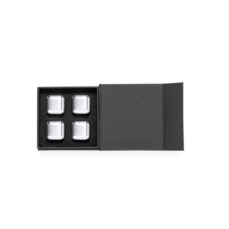 Set de 4 pierres réutilisables. Fabriquées en acier inoxydable, elles maintiennent la boisson fraîche sans altérer ses propriétés en ne diluant pas son contenu dans l'eau, tout en préservant son goût original. Présentées dans un élégant étui de couleur noire avec intérieur découpé. (couleur naturel)