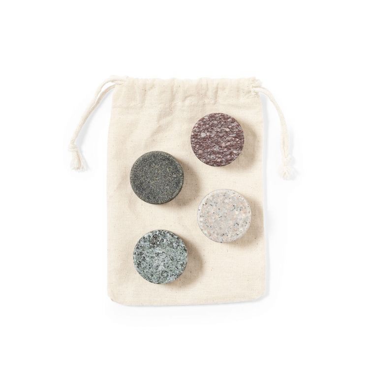 Set de 4 pierres réutilisables. Fabriquées en granit, elles maintiennent la boisson fraîche sans altérer ses propriétés en ne diluant pas son contenu dans l'eau, tout en préservant son goût original. Présentées dans une pochette en coton avec cordon de fermeture. (couleur naturel)
