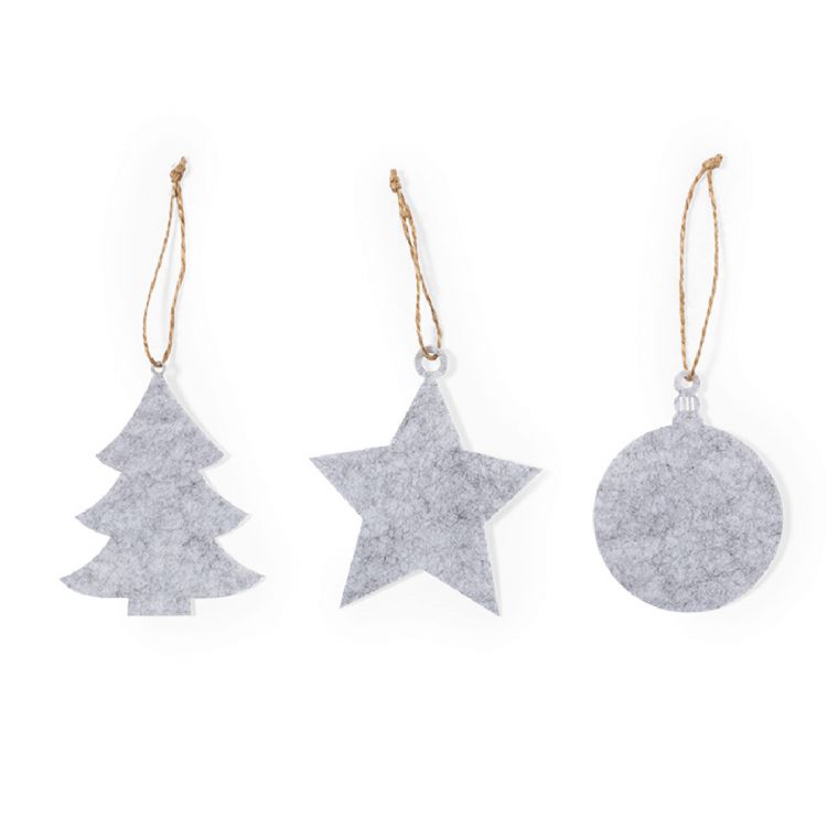 Ensemble de 3 décorations de Noël en feutre doux. Comprend 3 motifs : sapin de Noël, étoile et boule de Noël. Toutes les pièces comprennent un cintre. Présenté dans un sac en papier recyclé. (couleur gris)