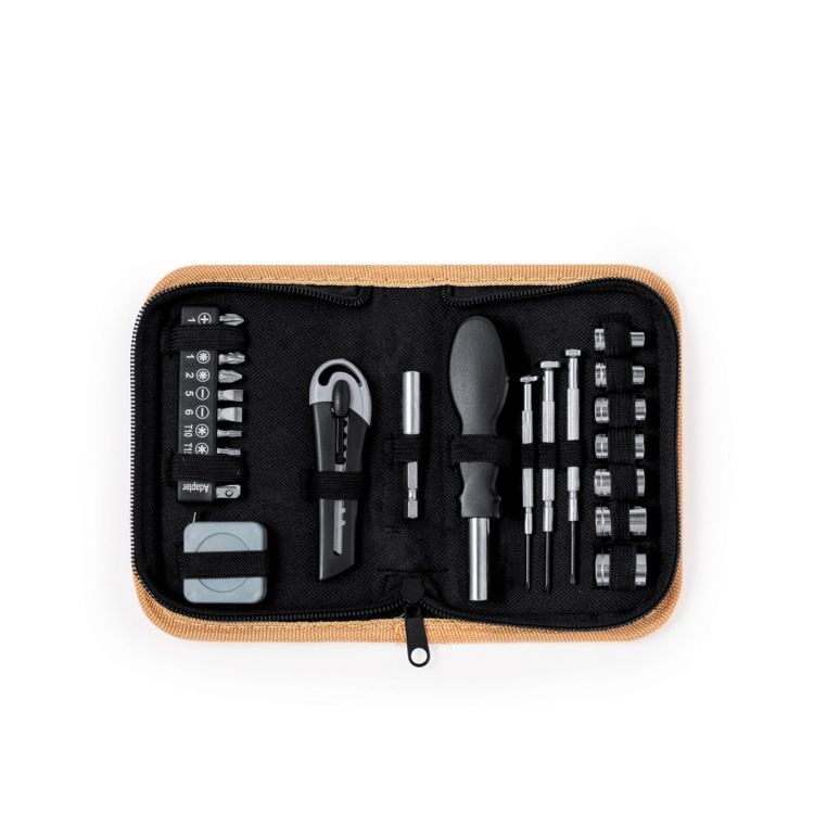 Ensemble d’outils de 24 accessoires dans un étui en liège avec intérieur rangé par des élastiques. Comprend des clés à tubes, tournevis de précision (plat et cruciforme), poignée multifonction avec différentes pointes interchangeables (extension, têtes cruciformes, plat, étoile et adaptateur), cutter et un mètre. Présenté dans une boîte de conception kraft.Élaboré à partir d’éléments végétaux pour encourager l’utilisation de matières premières naturelles et réduire les émissions polluantes. (couleur naturel)