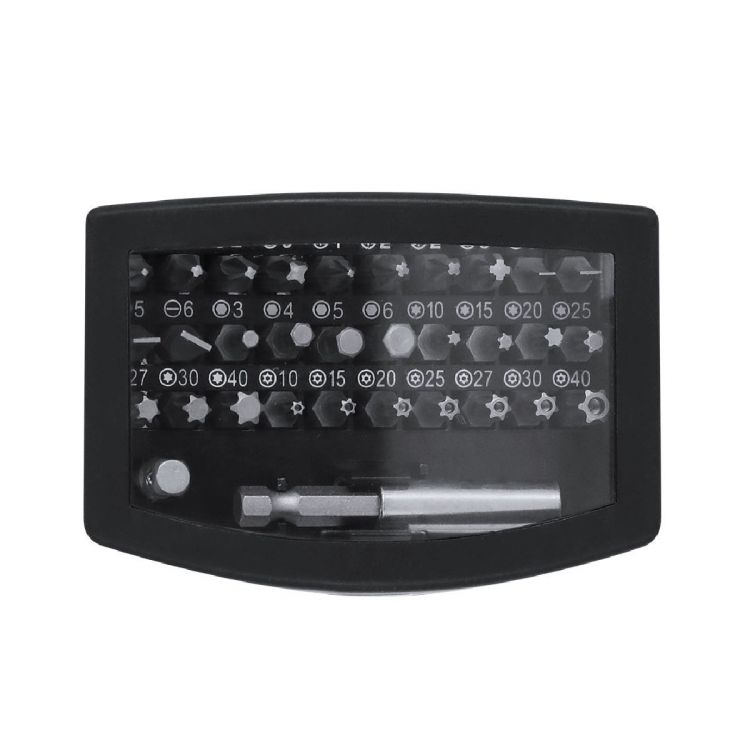 Ensemble d’outils pratique avec un boîtier en ABS. Comprend un adaptateur de précision avec 32 accessoires magnétiques, comprenant diverses pointes : philips, étoile, plat, hexagonal et torx. (couleur noir)