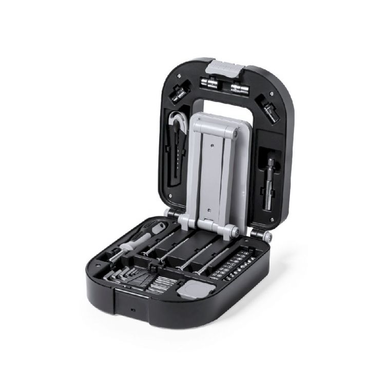 Ensemble original d'outils avec lumière et 30 accessoires. Présenté dans un coffret en ABS noir résistant avec serrure. Lampe pliante intégrée au boîtier, avec 24 LED et bouton ON/OFF. Comprend un tournevis avec une multitude d'embouts plats, philips, torx... Avec un kit de tournevis de précision clés à tube et clés Allen de différentes tailles cutter et flexomètre 1m. Lampe à piles (3xAA non incluses). Présenté dans une boîte design kraft individuelle. (couleur noir)