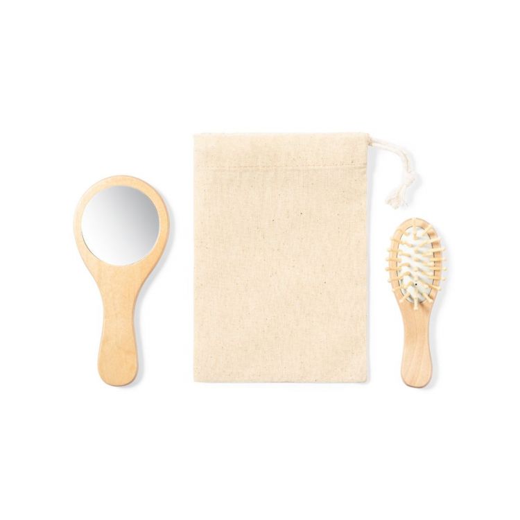 Ensemble miroir et brosse en bois naturel. Présenté dans une housse coton, avec fermeture à cordon (couleur naturel)
