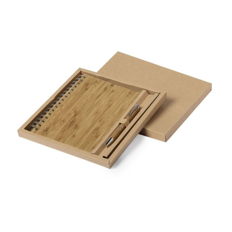 Carnet A5 avec stylo bille éco-friendly inclus. Carnet avec couverture rigide en bambou, avec 80 feuilles en format rayé et éco design. Stylo à bille poussoir, avec corps en bambou et accessoires en métal. Cartouche géante et encre noire. Présenté dans un étui en carton écologique. (couleur naturel)