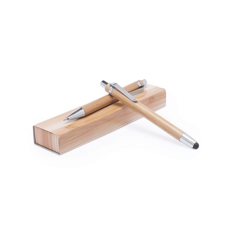Ensemble de stylo à bille à poussoir et porte-mines dans un mélange original de bambou naturel pour le corps et d´attributs métalliques coloris argent brillant. Présenté dans un étui individuel en carton brillant imitation bois. Stylo à bille à cartouche Jumbo encre bleue et porte-mines avec mines de 0,7mm incluses. (couleur naturel)