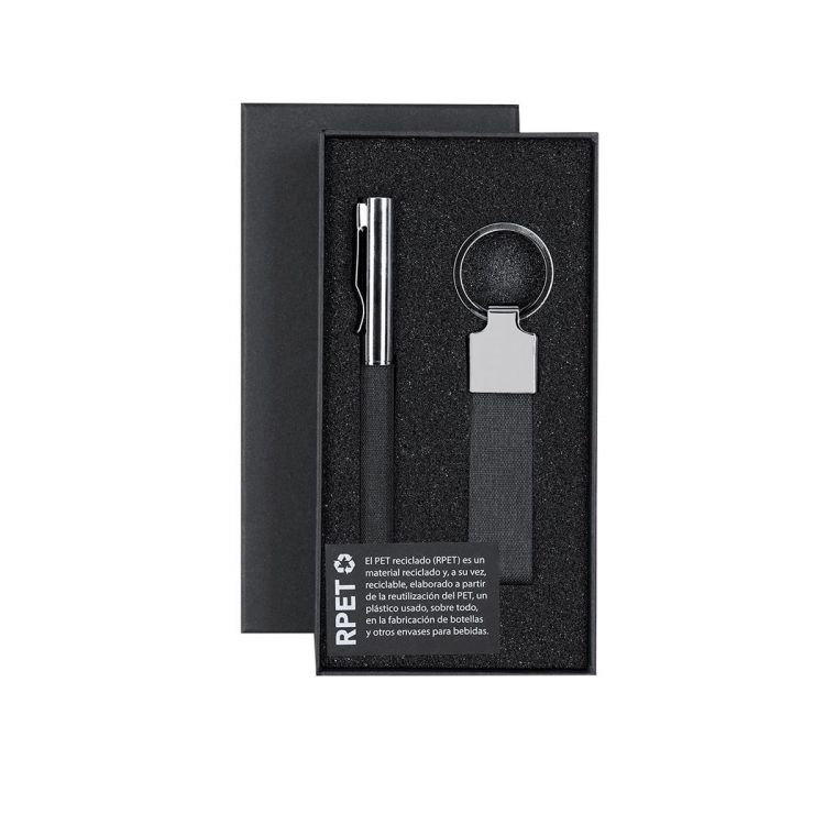 Élégant set en RPET avec finition noire bicolore et détails métalliques. Inclut:- Stylo en RPET avec finition noire bicolore et détails métalliques. Avec mécanisme rotatif et encre bleue.- Porte-clés en RPET avec finition noire bicolore et accessoires chromés.Présenté dans une boîte individuelle noire. Inclut une carte noire intérieure avec marquage RPET.Le matériau RPET est fabriqué à partir de plastique recyclé, pour ainsi favoriser la réutilisation des déchets plastiques et aider à la durabilité de la planète. (couleur noir)
