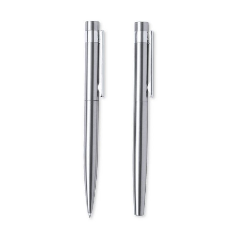 Ensemble écologique composé d'un stylo et d'un roller, en acier inoxydable recyclé. Comprend :Stylo bille à mécanisme rotatif, avec corps finition argent et accessoires chromés. Clip métallique et acier inoxydable recyclé distinctif sur le dessus du stylo. Cartouche Jumbo et encre bleue.Stylo roller avec corps argenté et accessoires chromés. Clip métallique et acier inoxydable recyclé distinctif en haut de la hotte. Cartouche Jumbo et encre bleue.Ensemble présenté dans un écrin design kraft individuel avec une housse assortie.L'acier est l'un des matériaux les plus demandés et peut être trouvé presque partout, des produits de tous les jours aux grandes constructions. Avec d'innombrables propriétés, y compris la durabilité et son haut degré de réutilisation, ce qui en fait une alternative très appréciée dans les solutions de durabilité. Correctement traité, il permet d'obtenir de nouvelles ressources d'utilisation infinie. (couleur argent)