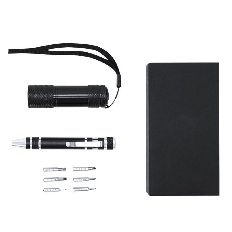 Set d'outils multifonction avec lampe de poche et tournevis en aluminium. Inclut :- Tournevis avec 6 têtes magnétiques : 3 plates et 3 étoilées, équipé d'un clip métallique pratique qui facilite son accrochage et son transport.- Lampe de poche LED avec 9 LEDs, alimentée par 3 piles AAA (non incluses). Comprend un cordon pour le poignet, offrant confort et sécurité dans son utilisation.Présenté dans une boîte noire. (couleur noir)