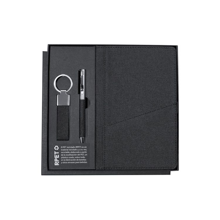 Élégant ensemble premium comprenant : Bloc-notes en RPET de couleur noire élégante. Comprend une fermeture élastique, une poche frontale et un marque-page en tissu. Intérieur avec 80 feuilles à lignes.Stylo en RPET de finition noire mate, mécanisme à rotation et encre bleue. Avec clip et extrémité en métal poli.Élégant porte-clés avec ruban fabriqué en polyester RPET 300D et accessoires chromés.Ensemble présenté dans un étui individuel de finition mate, avec des découpes intérieures pour chaque élément de l'ensemble et une carte en RPET à l'intérieur.Le matériau RPET est fabriqué à partir de plastique recyclé, afin de promouvoir la réutilisation des déchets plastiques et d'aider à la durabilité de la planète. (couleur noir)