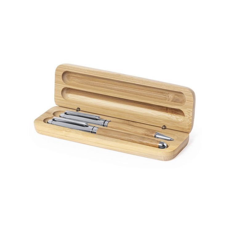 Ensemble de stylo et rouleau de la ligne de nature. Fabriqué en combinaison de bambou et de métal, afin d’encourager l’utilisation de matières premières naturelles et de réduire les émissions polluantes. Stylo à mécanisme rotatif à l’encre bleue. Rouleau avec capot, encre gel en bleu et charge jumbo. Présenté dans un cas individuel en bambou. (couleur naturel)