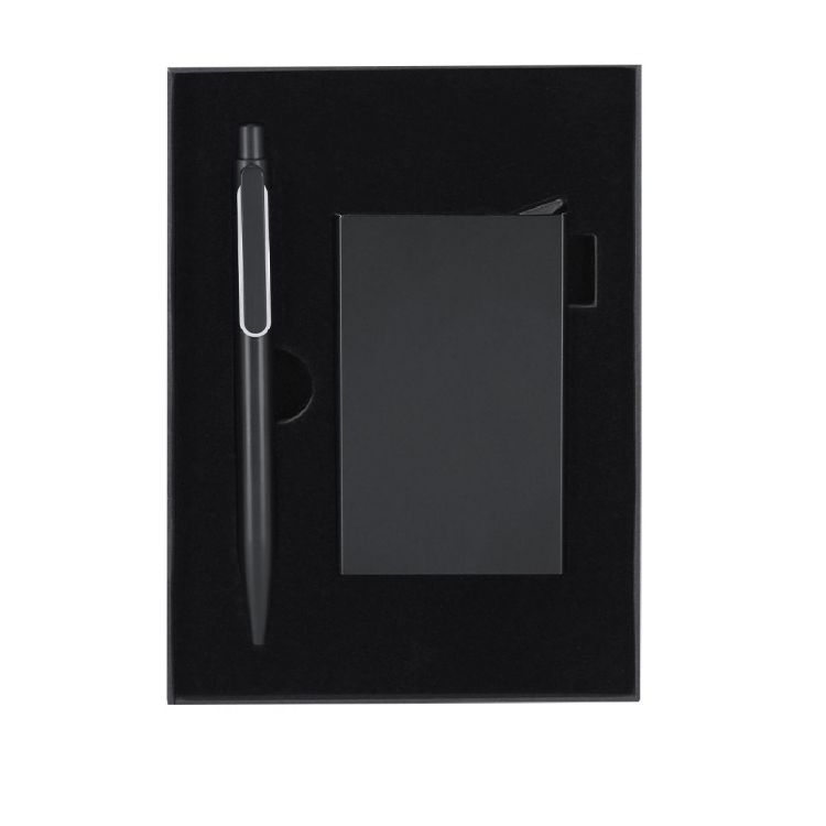 Set de stylo et porte-cartes fabriqués en Aluminium Recyclé.Le set comprend :- Stylo en noir mat fabriqué en Aluminium Recyclé à mécanisme à bouton avec clip et élément décoratif en métal poli. - Porte-cartes en noir fabriqué en Aluminium Recyclé pouvant contenir 6 cartes avec RFID et mécanisme à bouton pour extraire les cartes.Les deux avec logo en Aluminium Recyclé gravé et présentés dans une élégante boîte noire avec intérieur découpé.L'Aluminium Recyclé est un matériau avec des possibilités de recyclage presque infinies, sans perdre ses propriétés originales et consommant moins d'énergie dans ce processus.Certification GRS (Global Recycled Standard / Standard de Recyclage Global), qui garantit l'origine recyclée du matériau utilisé pour fabriquer le produit. (couleur noir)