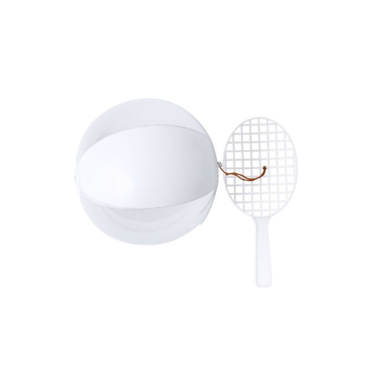 Amusant set de raquette et ballon avec valve de gonflage en combinaison de blanc et translucide, reliés par un élastique. Chaque set est présenté dans un sac recyclé. (couleur blanche)