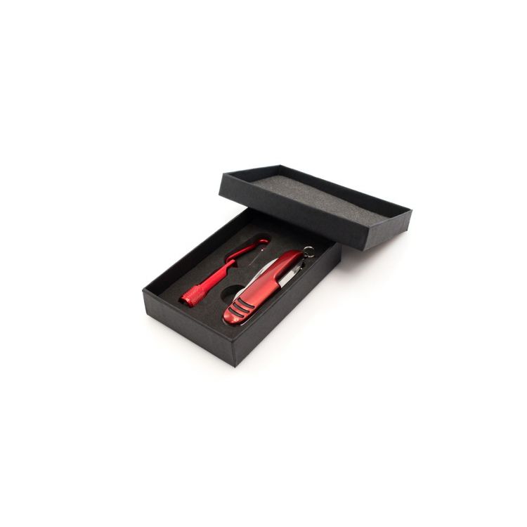 Set en aluminium composé d´un couteau multi-fonctions de 7 fonctions et d´une lampe mousqueton. Proposé en plusieurs coloris et présenté en étui individuel avec fenêtre et mousse intérieure douce découpée. Piles à bouton incluses.