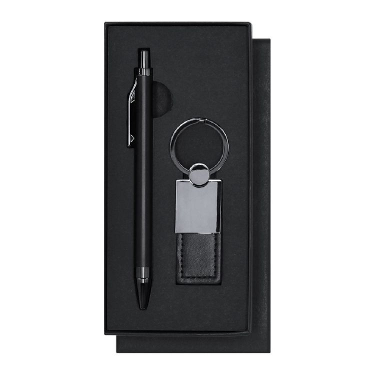 Ensemble premium élégant comprenant : Stylo en aluminium recyclé avec finition noire mate, mécanisme à bouton-poussoir et encre bleue. Avec un clip et un bout poli en ABS. Comprend un badge en aluminium recyclé. Porte-clés élégant avec ruban en PU, polyester et accessoires chromés. (couleur noir)