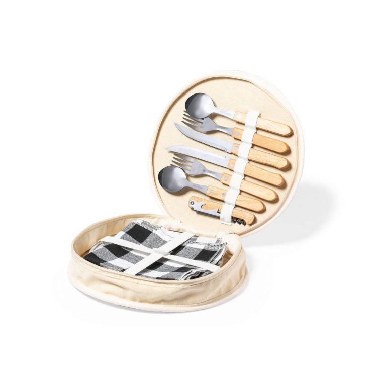 Set de pique-nique original avec 2 services. Présenté dans une housse coton résistante avec une finition naturelle, avec une fermeture à glissière et une poignée de transport. Intérieur renforcé, avec compartiments pour différents accessoires. Contenu: 2 cuillères, 2 couteaux et 2 fourchettes en acier inoxydable avec manches en bois naturel 2 plaques en acier inoxydable de 19,5 cm de diamètre. 2 serviettes en tissu de 30 x 30 cm. Avec un design rétro dans un motif à carreaux et dans une combinaison de tons noirs, gris et blancs. Tire-bouchon en acier inoxydable, avec couteau intégré et manche en bois naturel Planche à découper et de présentation de 15 x 15 cm, en bois naturel et avec manche découpé. (couleur naturel)