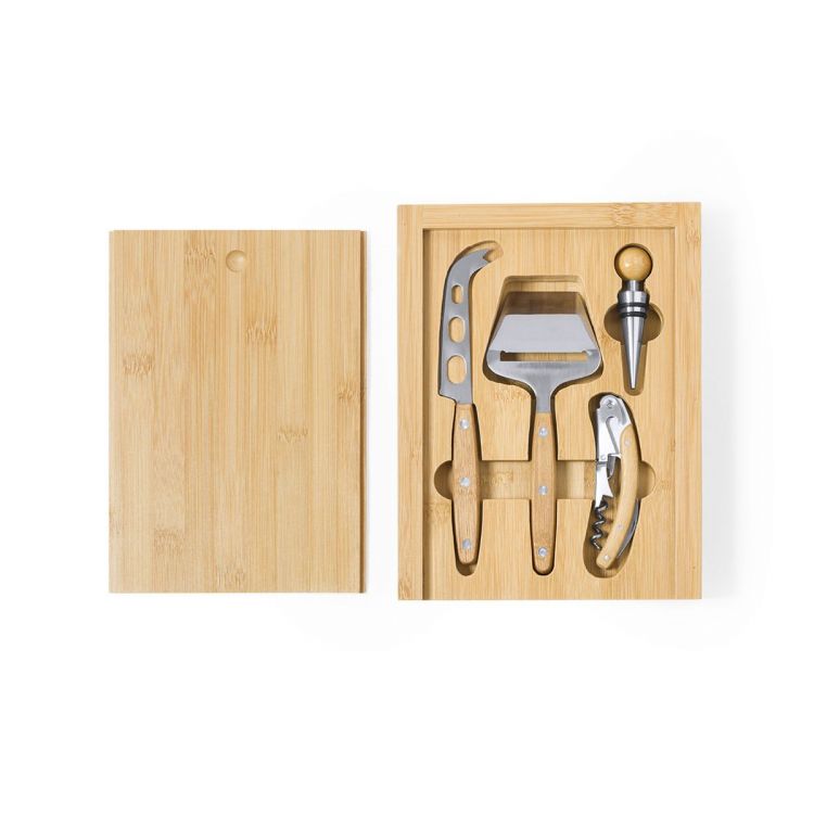 Complete set de vin et de fromage de 4 pièces. En bambou, avec couvercle de planche à découper et accessoires en métal avec poignée en bambou. Inclus un tire-bouchon, un bouchon, un couteau et une râpe à fromage. Présenté dans une boîte individuelle éco-conçue. (couleur naturel)