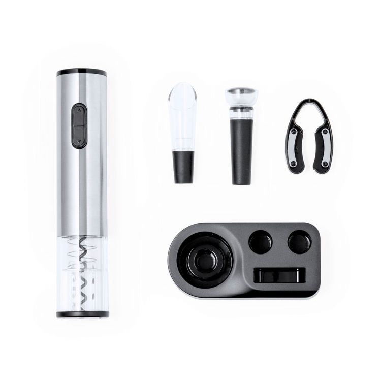 Ensemble de vins pratiques avec 4 accessoires. Contient un tire-bouchon électrique alimenté par 4 piles AAA (non incluses), décanteur, bouchon de bouteille et coupe-capsules, avec mécanisme à pression. Comprend, une élégante base noire pour avoir les accessoires triés. Présenté dans une boîte de conception kraft. (couleur naturel)
