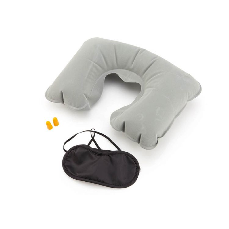Set de voyage comprenant 3 accessoires présentés dans un étui doux en suédine, proposé en couleurs vives. Comprend un masque en microfibre noire douce et confortable avec 2 élastiques assortis pour réglage, un oreiller cervical gonflable en suédine, ainsi que de confortables bouchons d´oreilles en EVA, coloris orange.