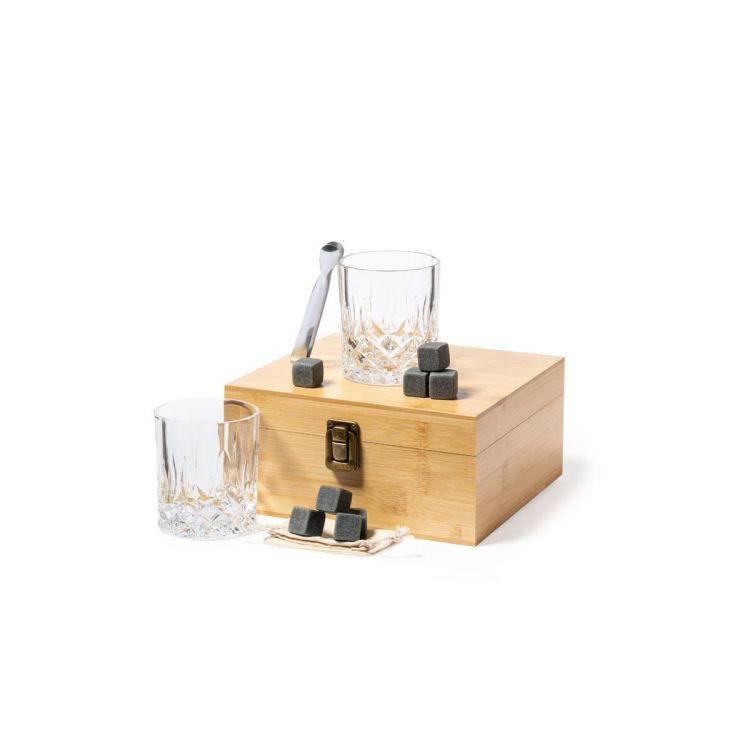 Service à whisky dans un élégant étui en bambou avec intérieur découpé. Comprend 2 gobelets en verre de 320 ml, une pince et 8 cubes de pierre naturelle réutilisables, avec une housse en coton. Présentation en boîte individuelle de conception kraft.Les cubes réutilisables sont faits de pierre de stéatite naturelle, également connue sous le nom de pierre à savon ou de roche, qui maintient la boisson froide sans altérer ses propriétés en ne diluant pas son contenu avec de l'eau, en plus de conserver sa saveur d'origine. (couleur naturel)