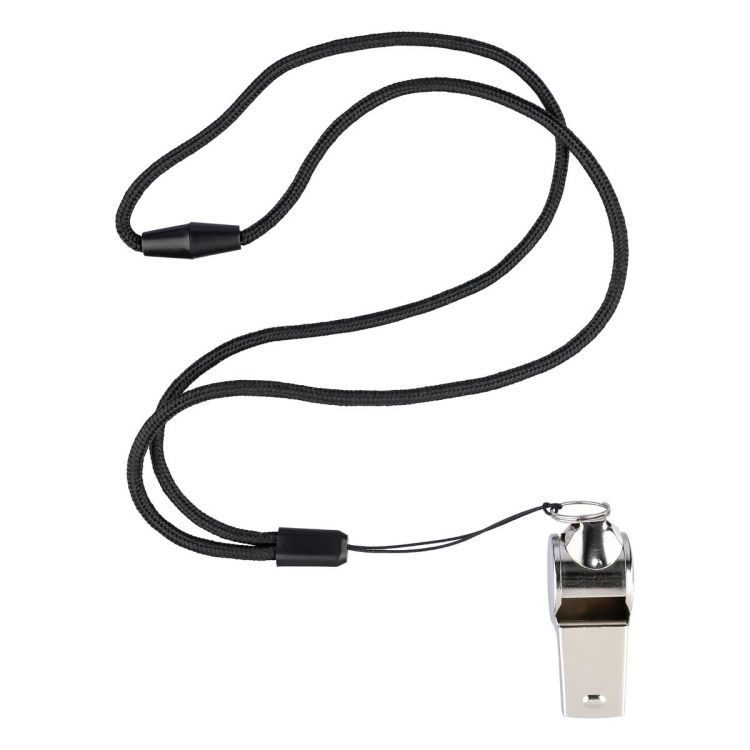 Sifflet tour de cou en métal avec cordon anti-étranglement en polyester dans une boîte cadeau en kraft.