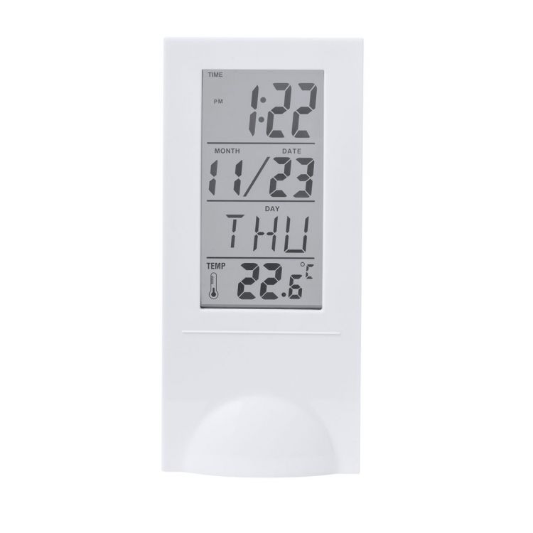 Station météorologique fabriquée en ABS résistant, avec capteur de température. Fonction heure (12/24), calendrier, alarme et jour de la semaine. Avec socle et boutons de commande arrière. Alimentation par pile (2xAAA non incluses) et présentée dans une boîte de conception kraft attrayante. Le mode d'emploi est disponible en anglais et espagnol. (couleur blanche)