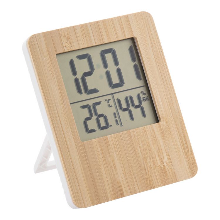 Station météo et horloge numérique avec façade en bambou. Fonctions : réveil, calendrier, thermomètre et affichage humidité. Fonctionne avec 2 piles AAA. Livré sans pile