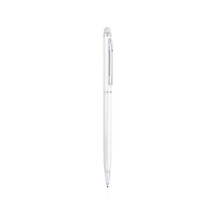 Stylo stylet à mécanisme rotatif, corps ultra-mince en aluminium finition métallisée et embout tactile assorti. Coloris variés. Attributs et bagues coloris argent. Encre bleue.