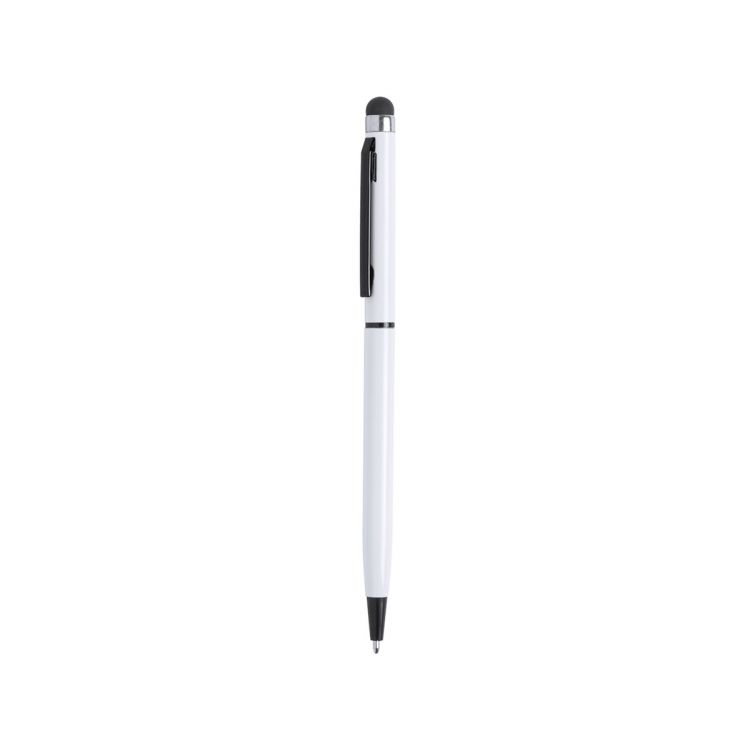 Stylo à bille pointeur avec mécanisme rotatif, corps en aluminium blanc et accessoires dans une large gamme de tons vifs. Avec clip découpé et encre bleue.