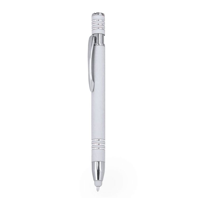 Stylo-bille avec mécanisme à bouton-poussoir et stylet, en aluminium. Finition caoutchoutée, spécialement conçue pour le marquage laser, révélant le logo en ton argenté. Accessoires plaqués chrome et clip assorti inclus. Encre bleue.