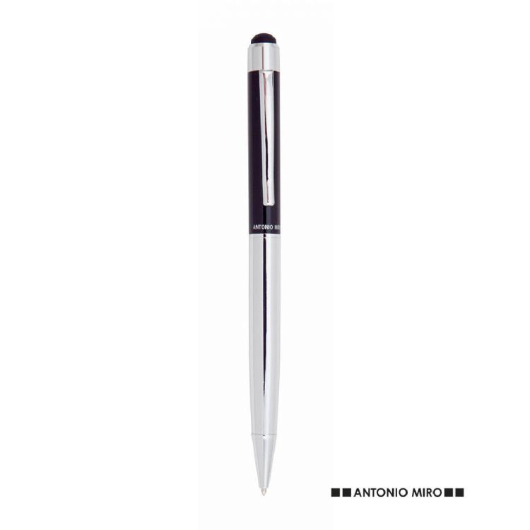 Stylo à bille Antonio Miró avec mécanisme rotatif, corps métallique lisse, élégante combinaison de couleurs argentée et noire. Clip et pointe de conception correspondante. Présenté dans un étui individuel noir avec le logo de la marque. Encre bleue. (couleur noir)