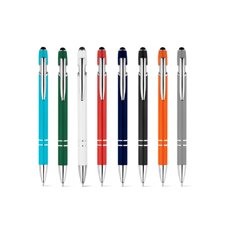 Stylo à bille en aluminium recyclé (100% rAL), avec pointe tactile en haut du stylo. Encre bleue