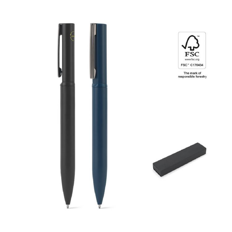Elégant stylo à bille en métal (60% recyclé), indispensable pour mettre en valeur votre marque. Il est doté d'un clip, d'un mécanisme à torsion et d'une encre bleue. Livré dans une boîte cadeau en papier kraft, fabriquée à partir d'un matériau certifié FSC™ et d'autres matériaux contrôlés
