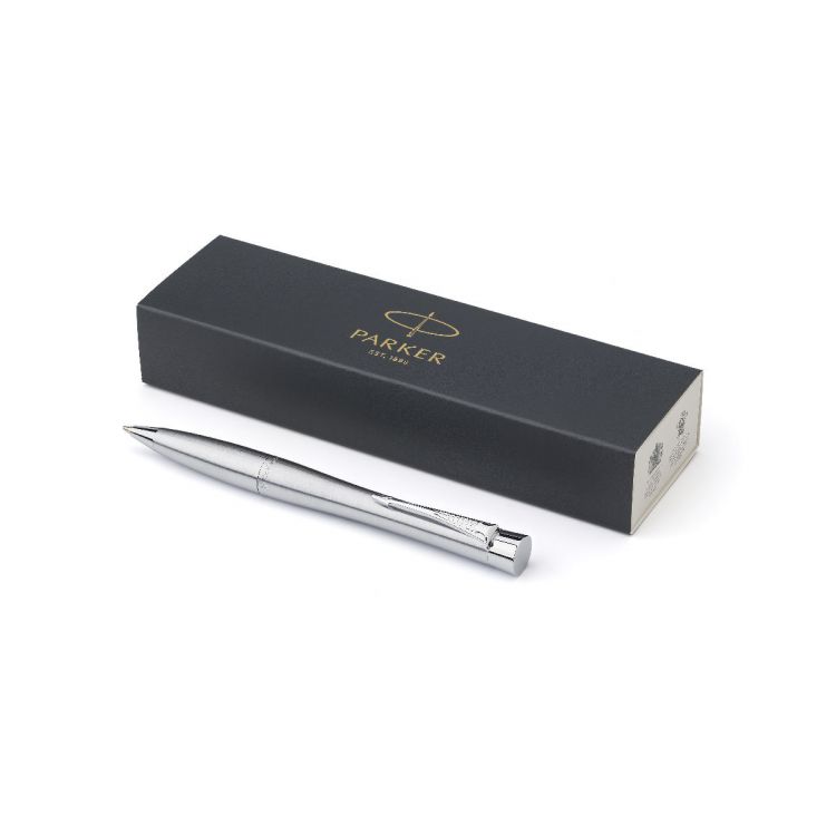 Stylo à bille twist Parker 'Urban' en acier inoxydable dans une boîte cadeau, mine bleue.