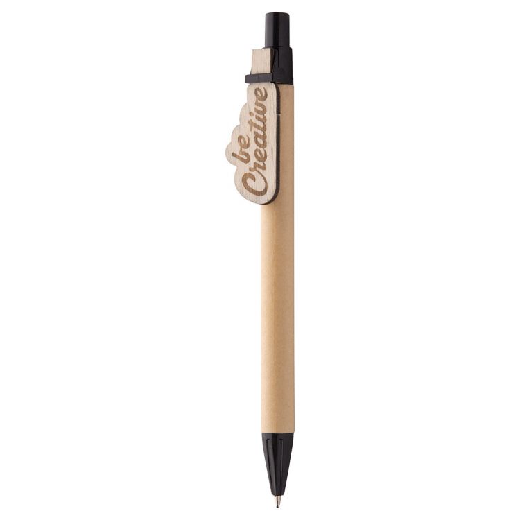 Stylo à bille en papier recyclé avec clip en contreplaqué personnalisable et encre bleue. Le clip est personnalisable à la forme - taille maximale : 25×35 mm. Le prix comprend la gravure du logo sur le clip. Quantité minimum : 100 pièces, de couleur noir