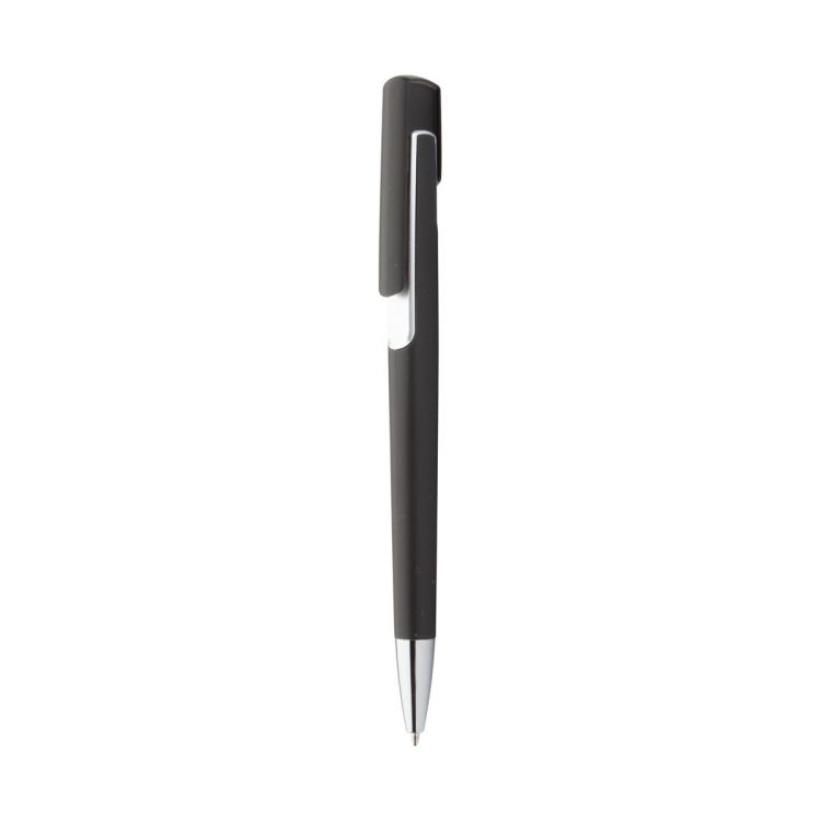 Stylo à bille en plastique avec décoration colorée et embout chromé. Encre bleue.
