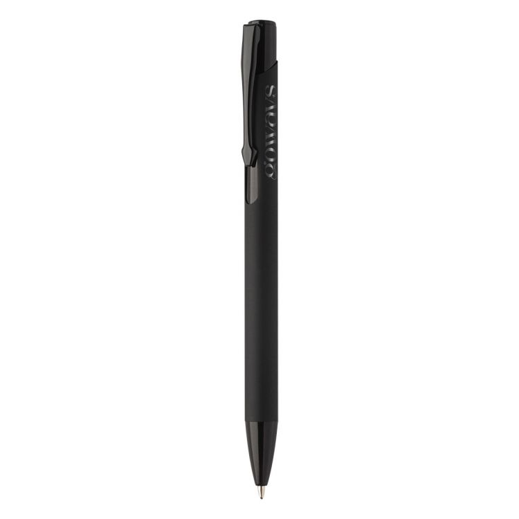 Stylo à bille en aluminium recyclé avec corps caoutchouté et parties colorées avec finition métallique brillante. Avec revêtement spécial pour gravure miroir assorti aux parties métalliques. Encre bleue.