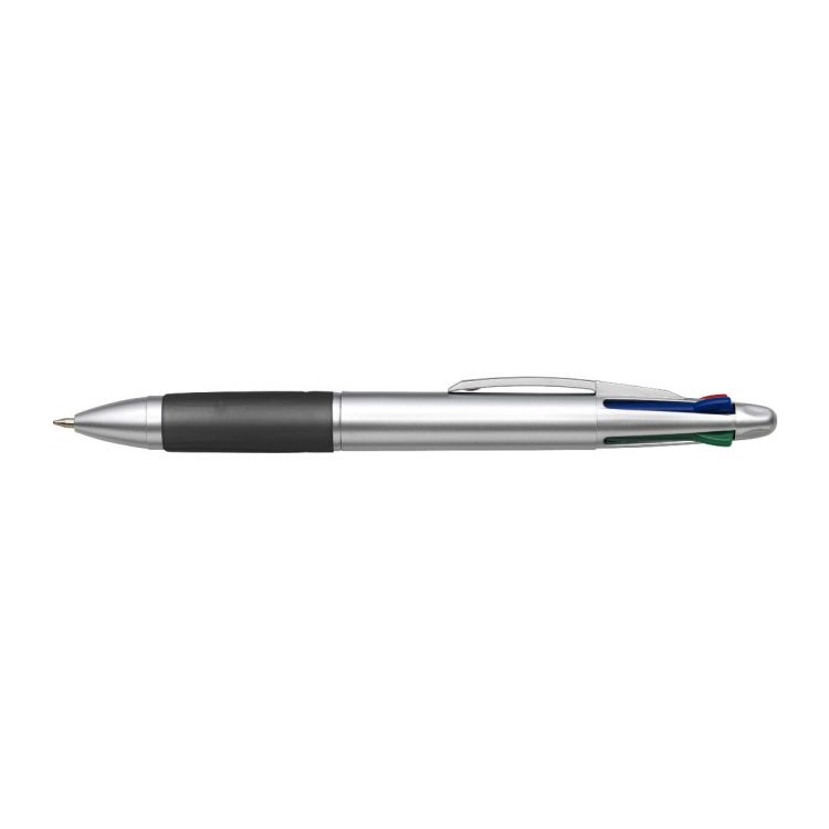Stylo bille en plastique avec embase en gomme muni de 4 mines rouge, noire, verte et bleue.
