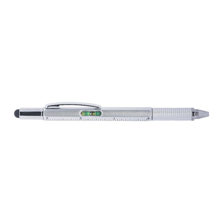 Stylo-bille multifonction en ABS muni d’un niveau, d’une règle, d’un tournevis et d’un embout pour écrans tactiles, mine noire.