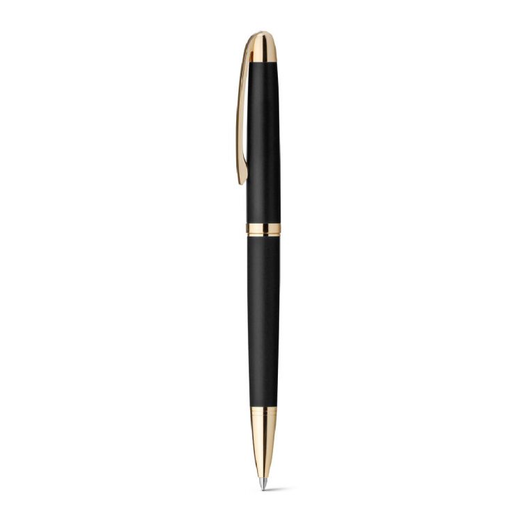 Stylo à bille en métal avec mécanisme twist avec clip et attributs dorés. Encre bleue. Livré dans un étui en papier kraft. Produit en couleur noir