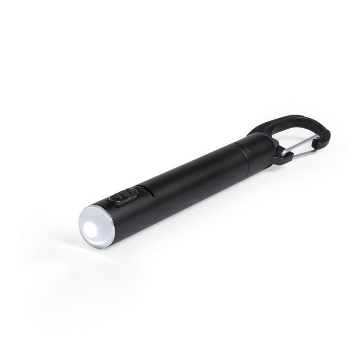 Stylo avec lampe LED intégrée. Forme originale en finition métallisée, corps plastique de différentes couleurs. Capuchon avec mousqueton. Encre bleue. Piles bouton incluses.