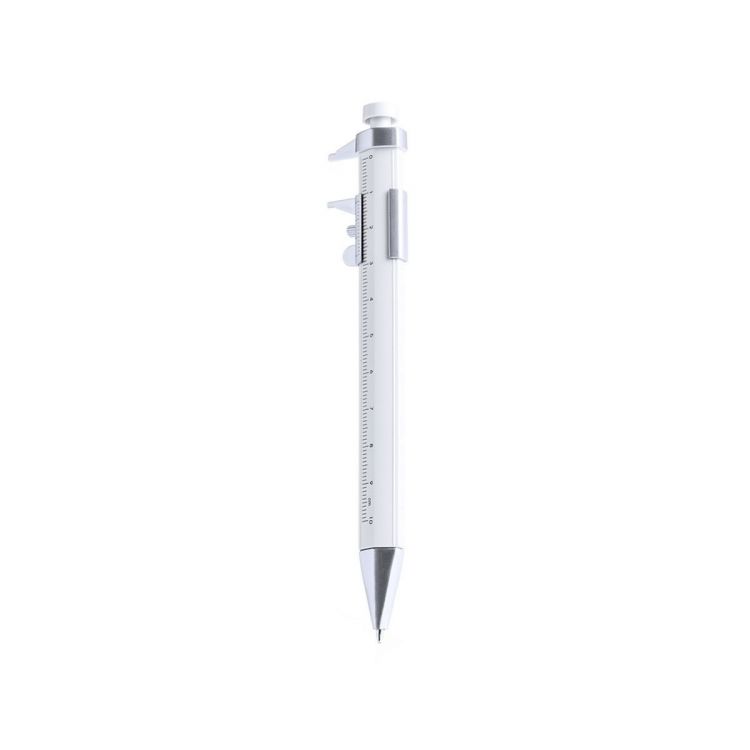 Stylo pied à coulisse à mécanisme pivotant. Avec règle de 10 cm intégrée sur le corps. Encre bleue. (couleur blanche)