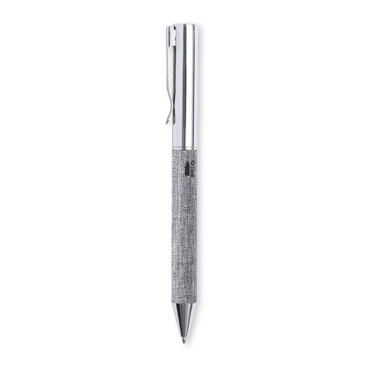 Stylo à bille en métal chromé et avec un corps recouvert de polyester RPET, fabriqué à partir de plastique recyclé pour encourager la réutilisation des déchets plastiques et contribuer à la durabilité de la planète. Clip métallique élégant et accessoires assortis, avec un mécanisme rotatif et à l'encre bleue. Avec RPET distinctif sur le corps et présenté dans un étui kraft avec une couverture assortie (couleur argent)